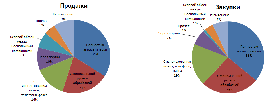 Возьмем для расчета приведенные на диаграмме цифры: вычтя из общего количества order-транзакций те, которые происходят с использованием почты, телефона и «прочими» способами, мы убедимся, что не менее 70% практикующих XML-обмен компаний так или иначе автоматизировали процесс обработки EDI-сообщений. Причем примерно половина из них добилась того, что XML-файлы обрабатываются без участия человека в этом рутинном процессе (см. синий сегмент диаграммы).
